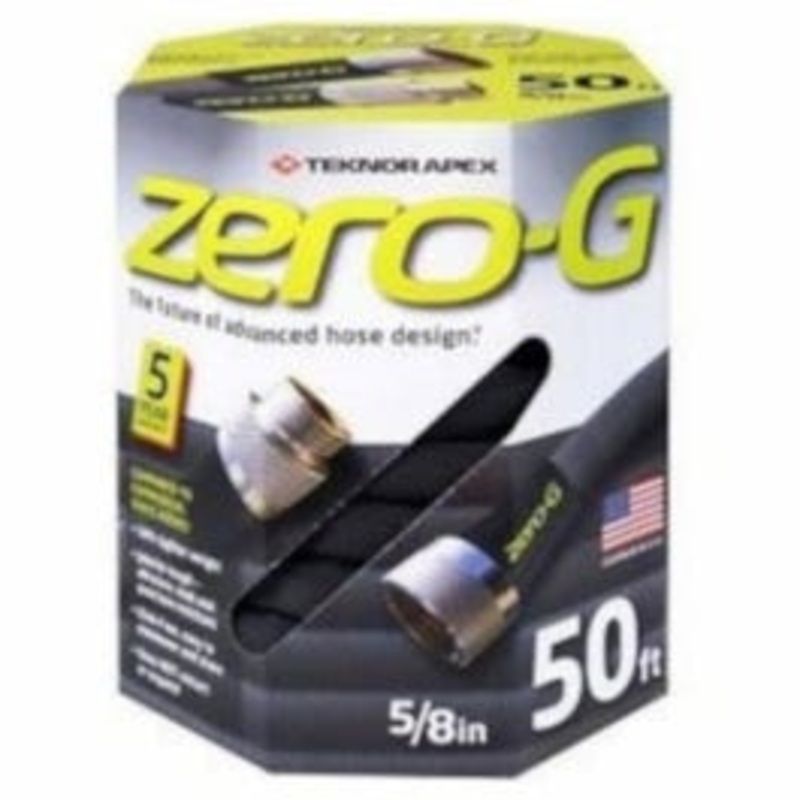 Zero-G 50′ gray garden hose. Lightweight, kink-free, flexible. Strong fiber outer sleeve. Flow rate equivalent to 5/8″ conventional hose. Drinking water safe. Ergonomic, crush resistant couplings. Patented design for easy handling & storage. 5 year warranty.