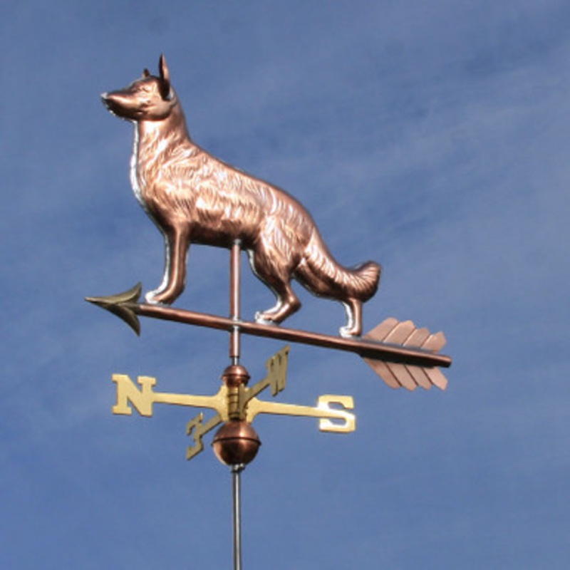 German Shepherd Weathervane Made in USA Elevate your outdoor space with the majestic German Shepherd Weathervane, a stunning piece of craftsmanship that celebrates the noble spirit of one of America's favorite dog breeds. Handcrafted from heavy-duty copper