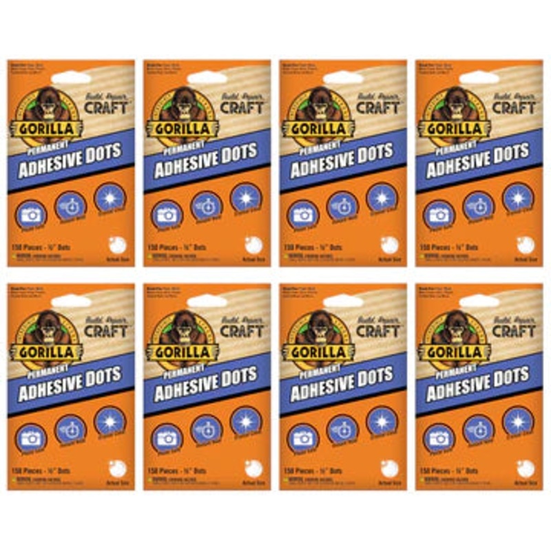 Includes 1,200 total dots (8 packs, 150 dots per pack)Gorilla Permanent Adhesive Dots are crystal clear with adhesive on both sides making them ideal for card making, scrapbooking, attaching photos, and embellishments.These no mess dots are a permanent alt