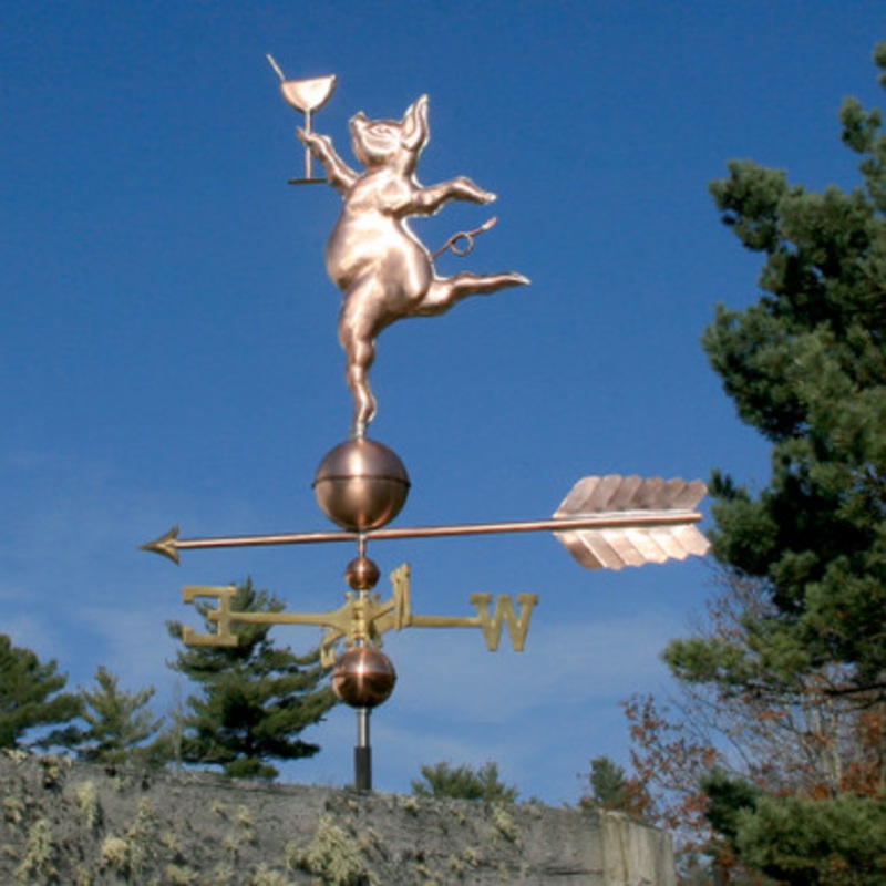 Grand Party Pig Weathervane - Made in USA Elevate your outdoor decor with the enchanting Grand Party Pig Weathervane, a delightful 3D masterpiece that embodies whimsy and charm. Crafted from heavy-duty copper, this dancing pig holds a martini glass, ready