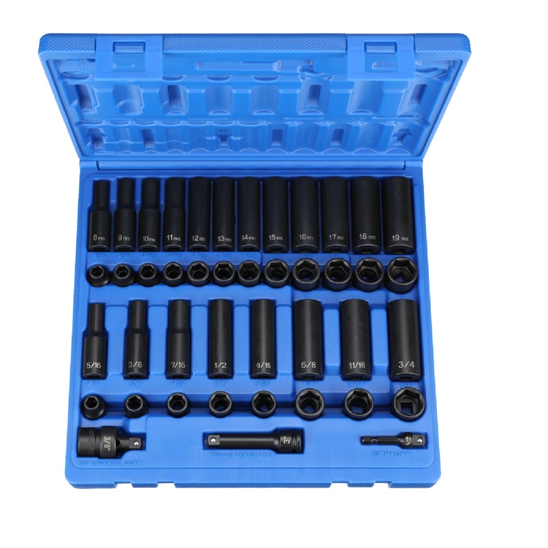 Standard and Deep Length Fractional Sizes: 5/16", 3/8", 7/16", 1/2", 9/16", 5/8", 11/16", & 3/4"Standard and Deep Length Metric Sizes: 8mm, 9mm, 10mm, 11mm, 12mm, 13mm, 14mm, 15mm, 16mm, 17mm, 18mm, & 19mm3/8" Drive x 3" Extension w/ Friction Ball3/8" Driv