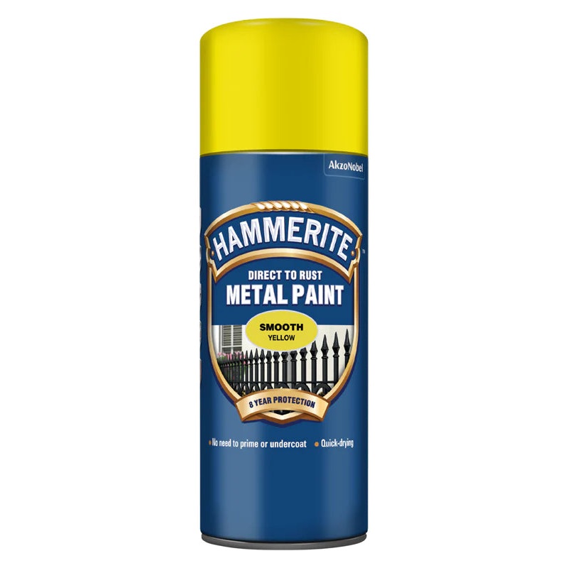 Hammerite Direct to Rust Metal Paint in a smooth finish which comes in a handy aerosol can for easy application. Its specially formulated to perform as a primer, undercoat and topcoat in one. This product can be applied directly to rust and dries quickly t
