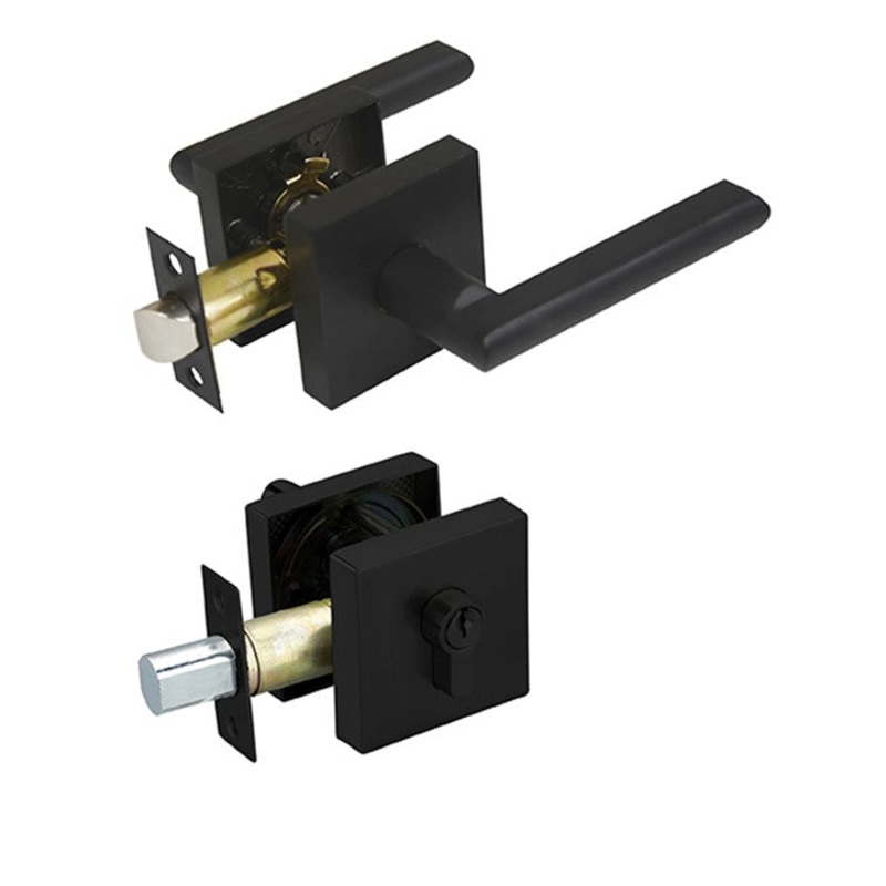 DescriptionSquare backing plate with a solid, architectural slim profile handle that mixes both square and round elementsSolid zinc alloy construction with a matt black finishSuitable for both left and right-hand opening doors by rotating handle 180 degree