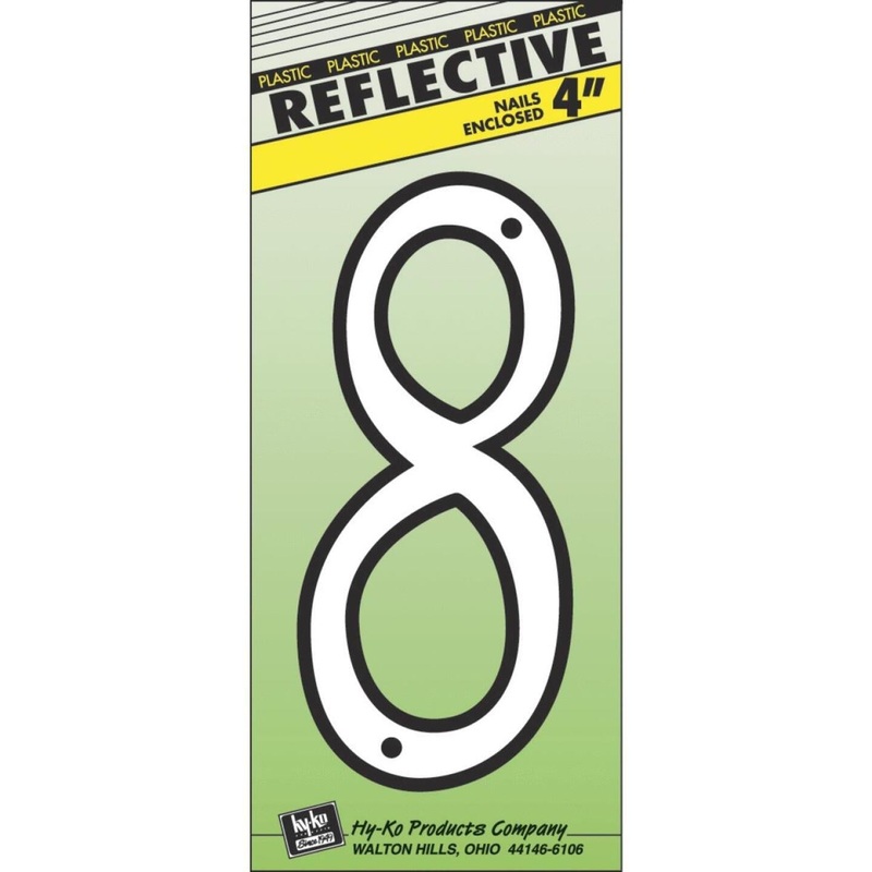 Reflective plastic raised script numbers. Comes with mounting nails. Aluminum color face on black plastic. Numbers 0 thru 9.