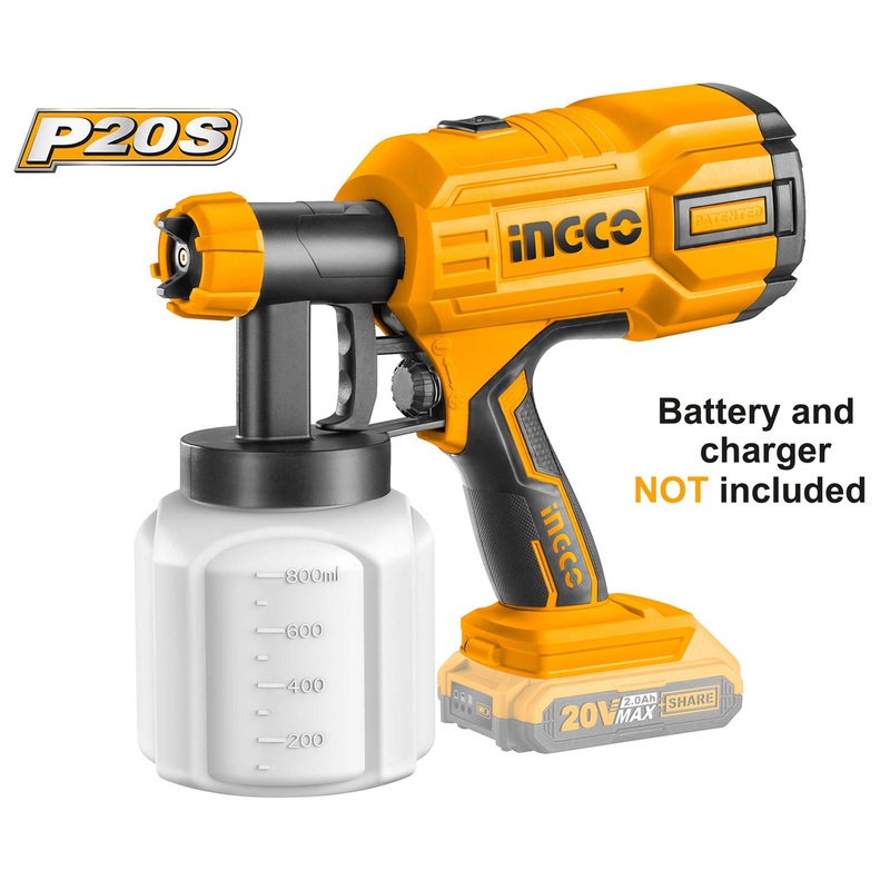 Ingco CSGLI2001 20V Cordless Spray Gun (Bare)Voltage: 20VSpraying Pressure:0 1-0 2BarMax flow:600ml/minMax viscosity:40DIN-sContainer capacity:800mlWith 1PCS viscosity measuring cupWith 1PCS nozzle cleaning needleNO battery and charger included6Months Limi
