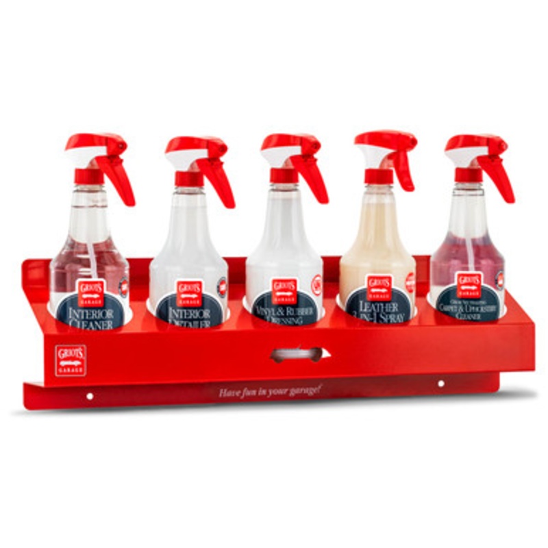 Step up your garage organization and keep all your essentials for cleaning your interior at arm's reach. Rack holds 5 of our favorite 22 oz interior productsConstructed of heavy duty, corrosion resistant 18-gauge galvanized steelDurable, gloss red powder c