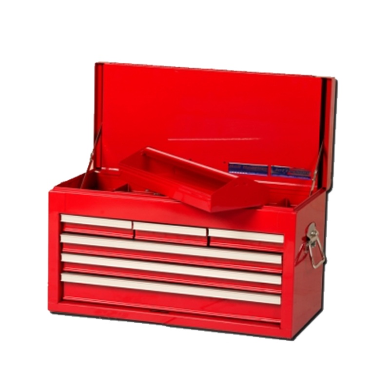 When the lid is open it is supported by 2 metal struts so the lid will not keep falling down. This tool chest is finished in a red powder coated finish.