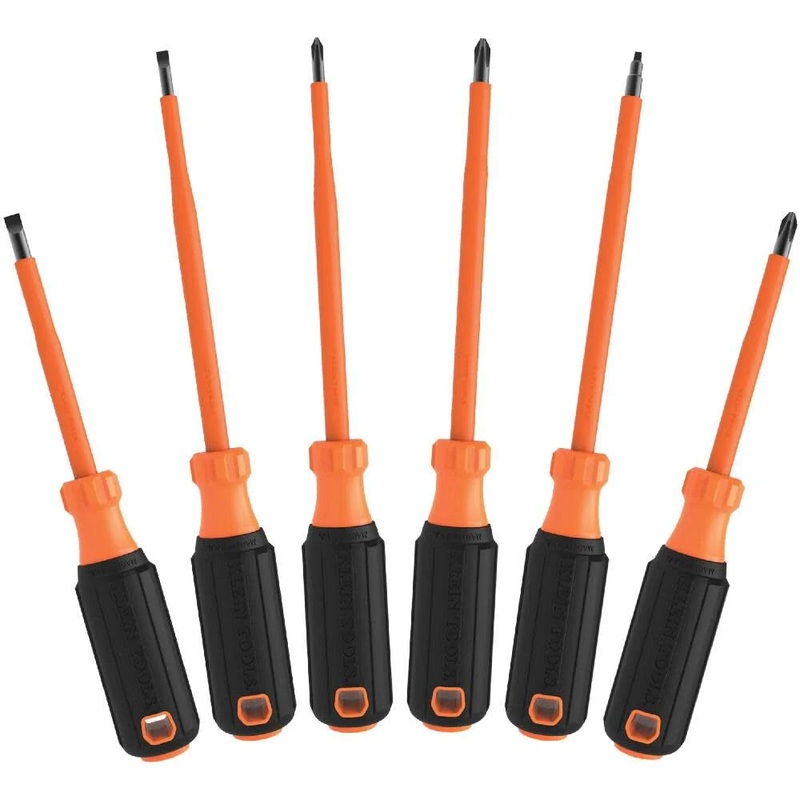 Klein Tools 85076INS Insulated Screwdriver Set features 1000V Screwdrivers, (3) Phillips and (2) Slotted and Square Tips, 6-Piece