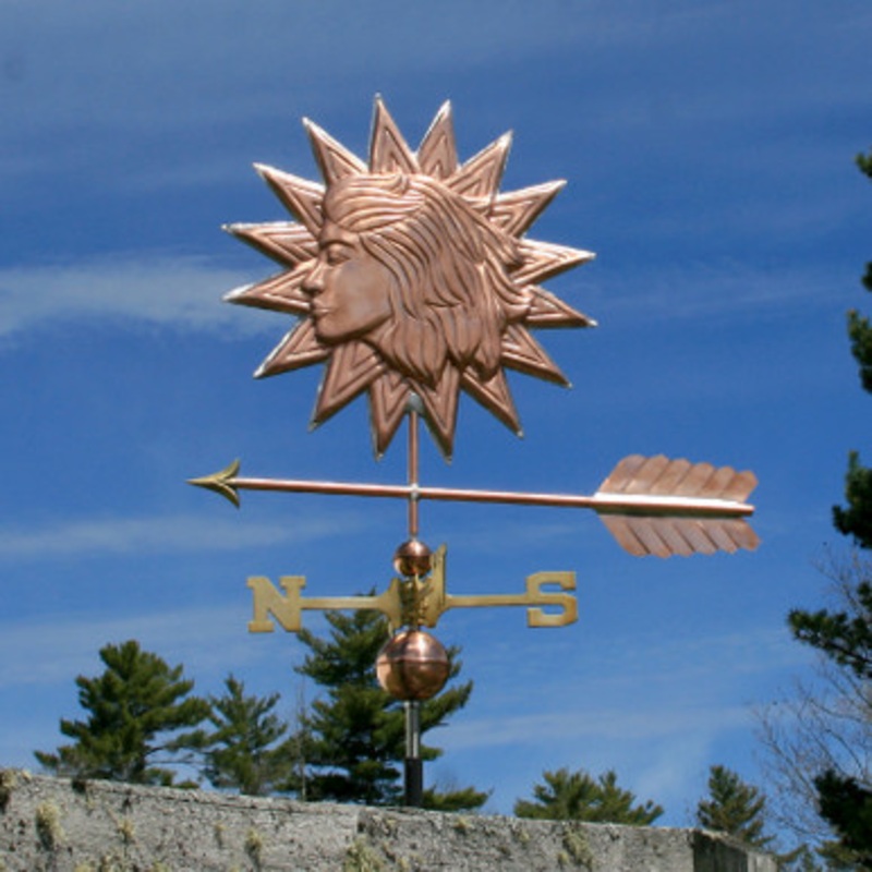 Lady in the Sun Weathervane Made in USA Elevate your outdoor spaces with the enchanting Sun Weathervane, a stunning embodiment of American craftsmanship that captures the essence of elegance and whimsy. Crafted from durable copper, this exquisite 3D design