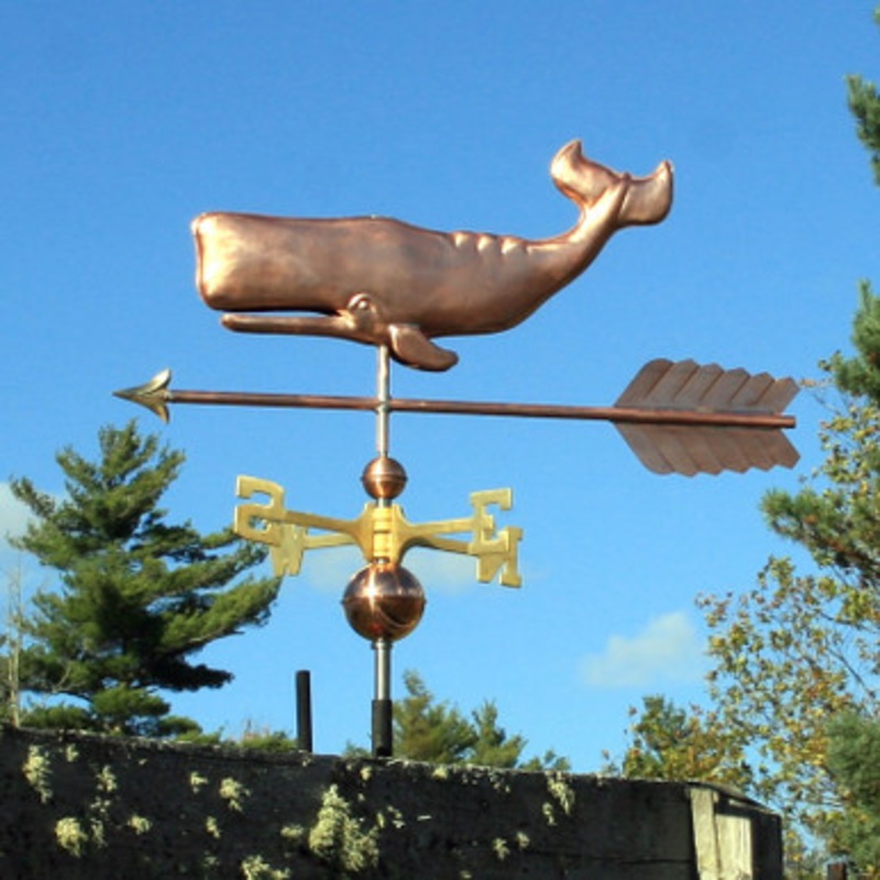Whale Weathervane - Made in USA Set sail on a journey of craftsmanship and elegance with our Large Sperm Whale Weathervane, a stunning 3D copper masterpiece that captures the majesty of the ocean right atop your cupola, shed, garage, barn, or gazebo. This