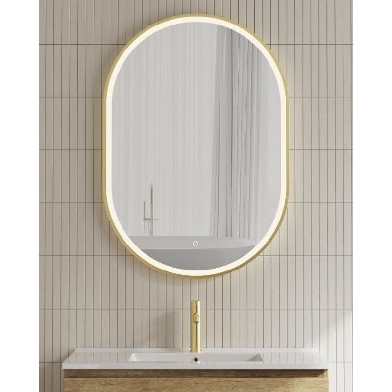 LED Mirror Brushed Gold Deluxe Oval Frame Front Lit with Sensor Touch - 500mm x 900mm- Deluxe brushed gold 35mm oval frame- High quality Finger touch button control-LED Colour Range: 3000k-4500k-6000k- Built In anti-fog function- IP54 Rated- Hardwired- Vol