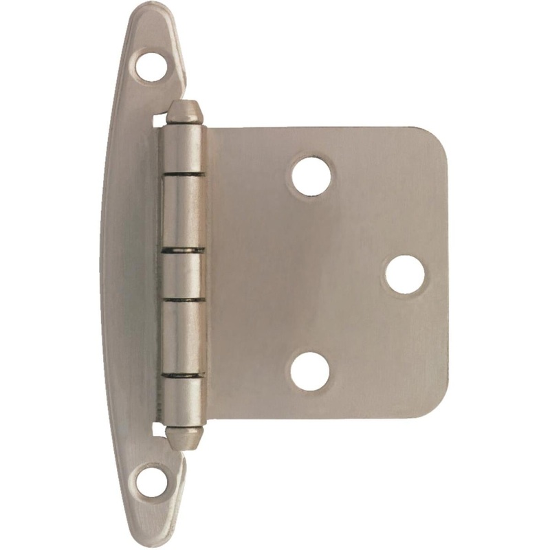Satin nickel overlay hinge with steel base. Non self-closing. 1.59 In. W. x 2.81 In. L. Installation hardware included.