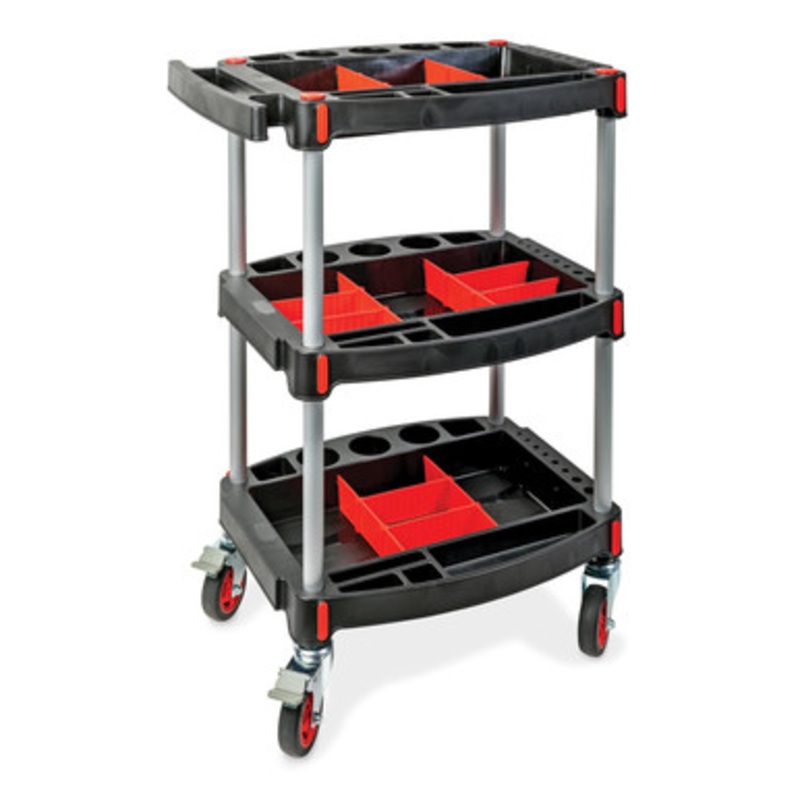 Keep all of your car care liquids, tools, and accessories on this convenient cart and free up your workbench for other projects.Deep shelves keep your car care essentials secureLocking casters keep cart in place while you workMolded plastic shelves feature