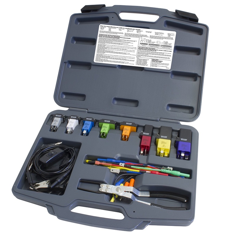 Interchangeable probes for a wide range of testing possibilities.Compatible with most multimeters and scopes with standard 4mm connectors.Kit includes 43" long 4mm banana test leads with straight and 90 connections, test probes, long back probes, safety te