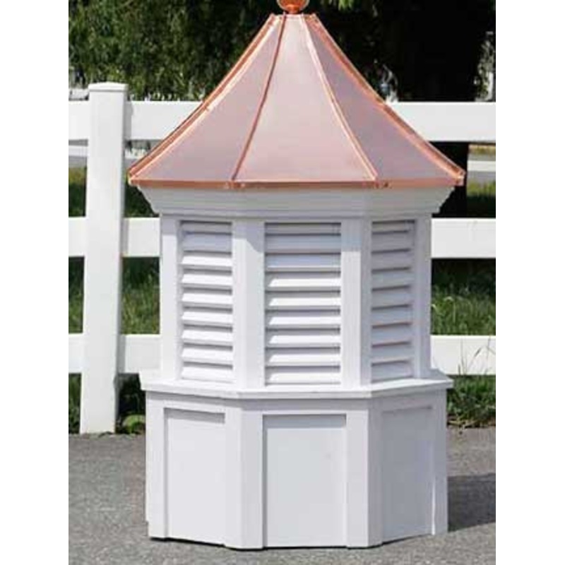 This cupola is available in maintenance-free vinyl and is weathervane ready with a 3/4 inch rod opening.Designed for up to a 8/12 pitch.Cupola roof is covered with standing seam copper or metal roofing is available.