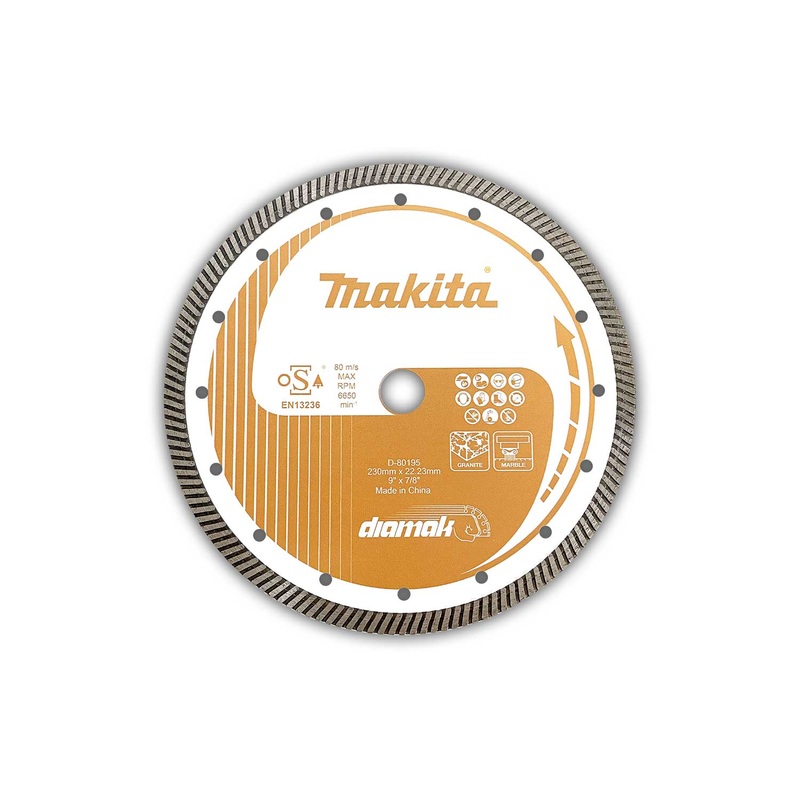 D-80189 | Makita DIAMAK Turbo Rim Diamond Wheel 180mm x 25.4mm180mm Outside Diameter, 25.4mm Inner Diameter. Turbo rim configuration delivers efficient material removal while allowing for improved chip clearance and faster cutting speeds, making it ideal f