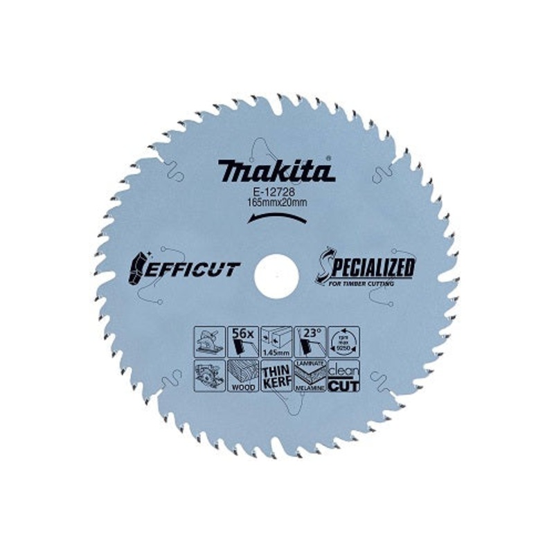 Makita EFFICUT 165mm 56T Fluorine Coated BladeThe 165mm 56T Extra hard tip Thin Kerf Efficut Saw Blade is ideal for a full range of wood cutting applications.The result is increased cutting efficiency, and users get up to 140% faster cutting speed compared