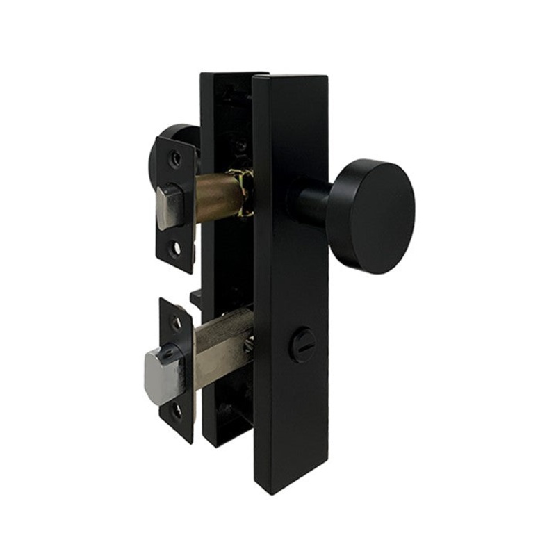 DescriptionJasper Series Round Privacy Knob Set with Long Face Plate Matt Black Finish50 mm diameter solid metal round knob handle mounted on a long rectangular face plateFace plate 42mm wide x 200mm longZinc alloy construction with a electroplated matt bl