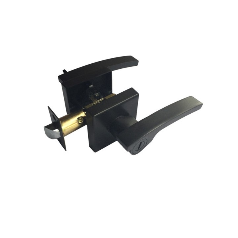 DescriptionA stylish, curved and compact handle in a bold matt black finishRobust construction of zinc alloy with a matt black finishReversible handles for both left and right hand doorsSnib lock on the inside and an emergency release button on the outside