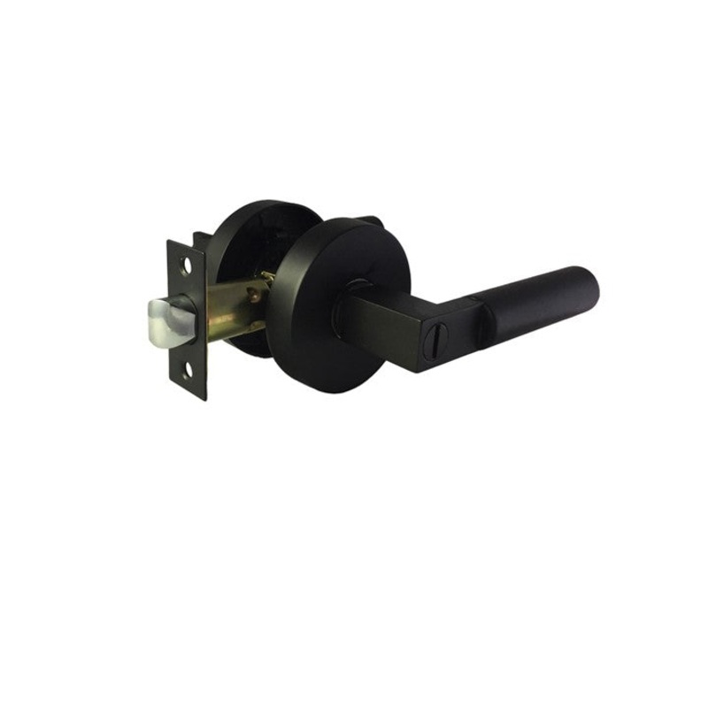 DescriptionSolid zinc alloy construction with a matt black finishSuitable for both left and right hand opening doors and door thickness from 35mm to 45mmSnib lock on the inside and an emergency release button on the outside70mm round backing plate fits mos