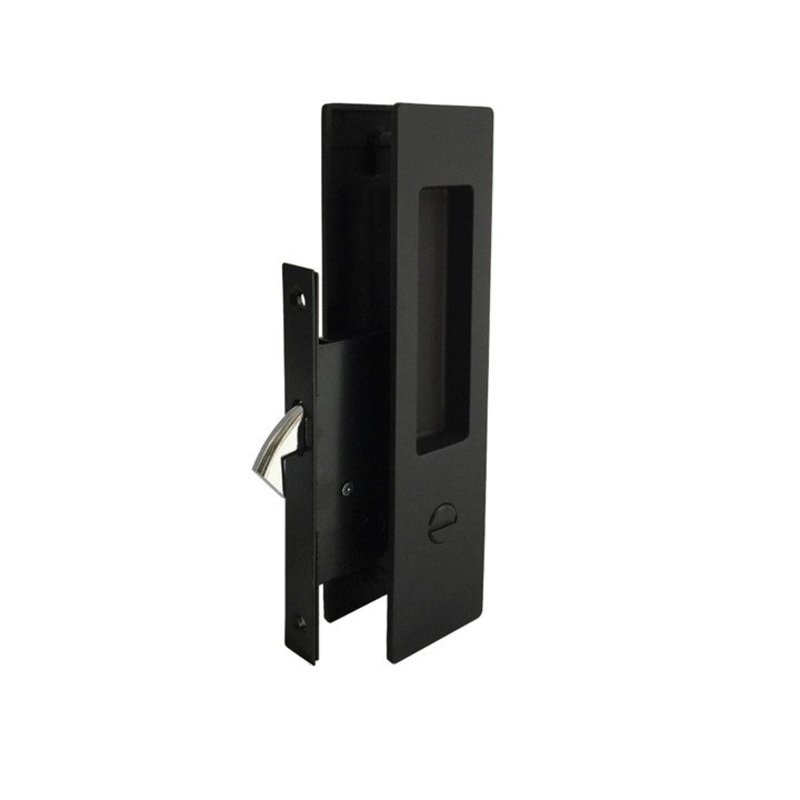 DescriptionMatt black privacy set with 180mm x 45mm faceplateFace plates designed to sit flush with doorto allow the door to completely slide into the wall cavityTwist snib lock inside and emergency opener outsideAlloy construction with matt black finishCo