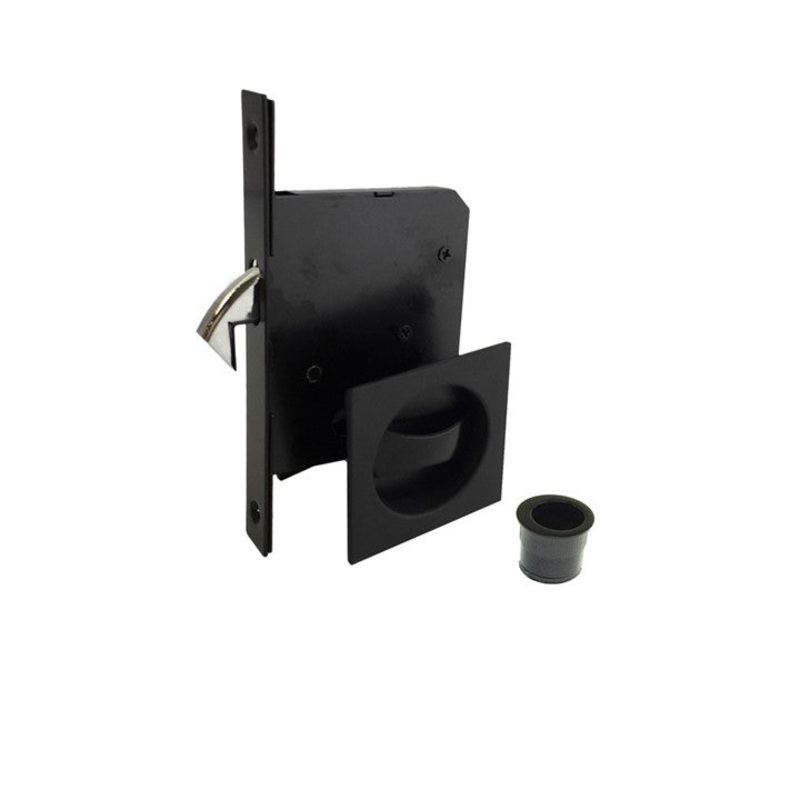 DescriptionRefined quality sliding door privacy lock with a finger pullPrivacy snib lock on the inside and emergency release button on the outsideSquare 65mm x 65mm plate will sit flush against the wood to allow the door to slide into the wall cavity (cavi