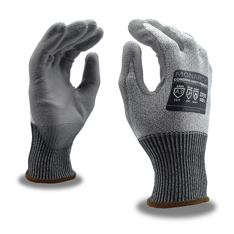 Cordova Safety Products-brand MONARCH high-performance, engineered fiber gloves are constructed of a versatile, multi-filament yarn that combines high-strength fiber, fiberglass and synthetic fibers to provide excellent abrasion, cut and contact-heat resistance. This MONARCH PU glove features a gray, 13-gauge, high-performance shell, gray polyurethane (PU) palm coating, and an A3 cut level. MONARCH gloves are easy to launder and unaffected by chlorine bleach and UV light.