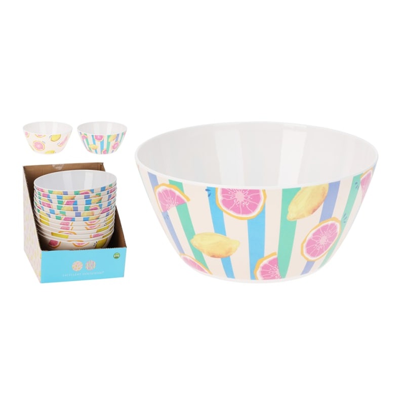 A large melamine bowl, great for serving up fresh salads at BBQs or picnics. Featuring and bright, fruit outer and available in 2 assorted designs.
