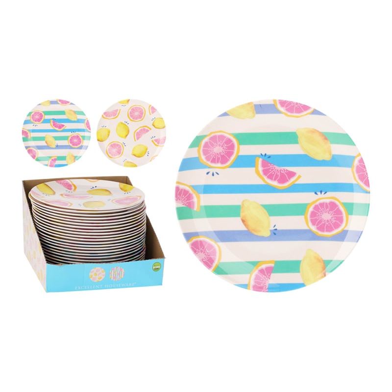 Serve up your picnic or BBQ on these handy melamine plates. Great for camping or garden parties, these plates come in 2 assorted colourful fruit designs.25cm diameter