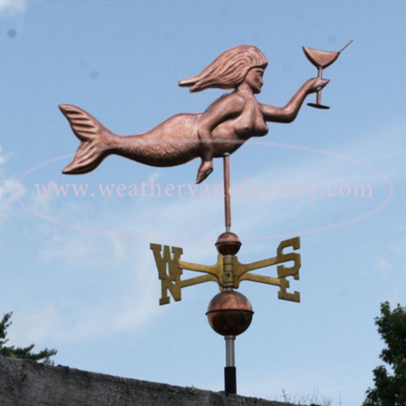 Mermaid Weathervane Made in USA Dive into the whimsical world of nautical charm with our stunning Mermaid Weathervane, Swimming with Martini! This 3D masterpiece is not just a weathervane; its a conversation starter that transforms any cupola, shed, garage