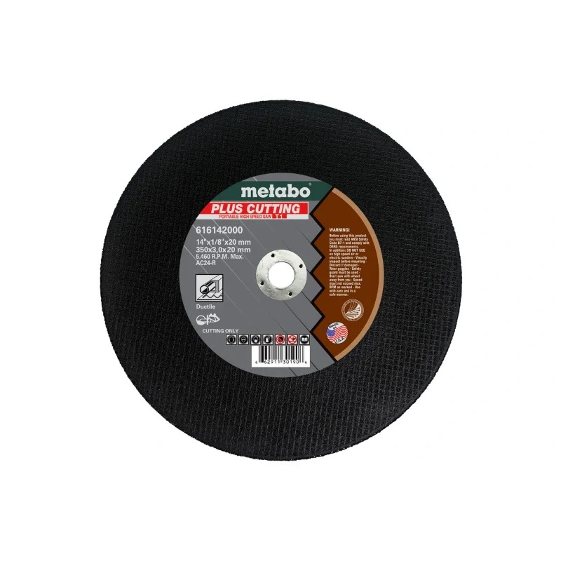 Metabo 616142000 PLUS 14" X 1/8" X 20MM - TYPE 1 - AC24RAluminum oxide and Silicon carbide combination wheel specially formulated for ductile iron. Excellent rate of cut. Excellent wheel life. Smooth and chatter free cutting.ParametersMaximum speed:5460 RP