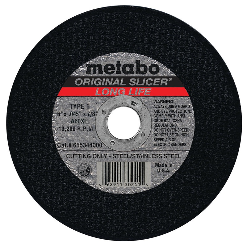 Metabo 655344000 6 In. x .045 Long Life SlicerLong life original Slicer: engineered aluminum oxide wheel for longer life cutting pipe, thin wall steel and stainless steel tubing, sheet metal as well as bar Stock. Excellent service life!FEATURESWeight: 8.5