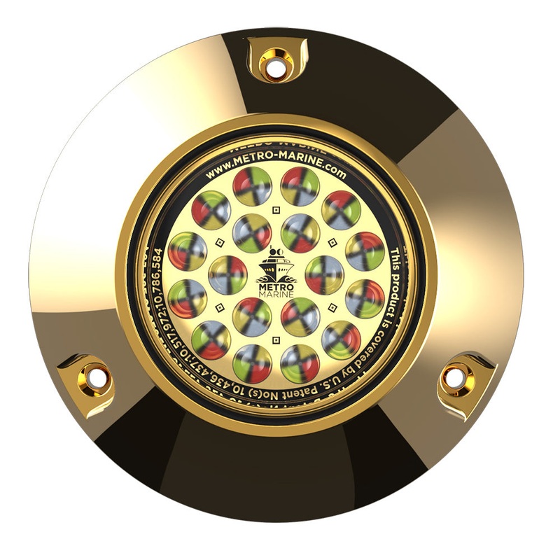 The F-Series line of underwater marine lighting fixtures is designed to mounted a depth of up to 4.6M (15′) below the waters surface to provide vibrant color and color-changing light in the water. With watertight aluminum bronze housings and silicon bronze hardware, Metro Marines F-Series luminaires are perfect for marine-based applications such as mounting to yachts, docks, sea walls, as well as for use in fountains and theme park installations. . Leveraging Metros rich legacy of innovation and leadership in optics & LED control technology, the F-Series underwater lighting fixtures introduce a unique LED array to the market with 72 H.O. LEDs per fixture, allowing close adjacent fixture placement where fully-mixed, uniform light is important. Our F-Series RGBW Luminaires also integrate a separate white LED in each of the 18 individually optically lensed RGBW LED configurations, creating higher-quality whites and richer color blends than possible with traditional RGB+White fixtures.