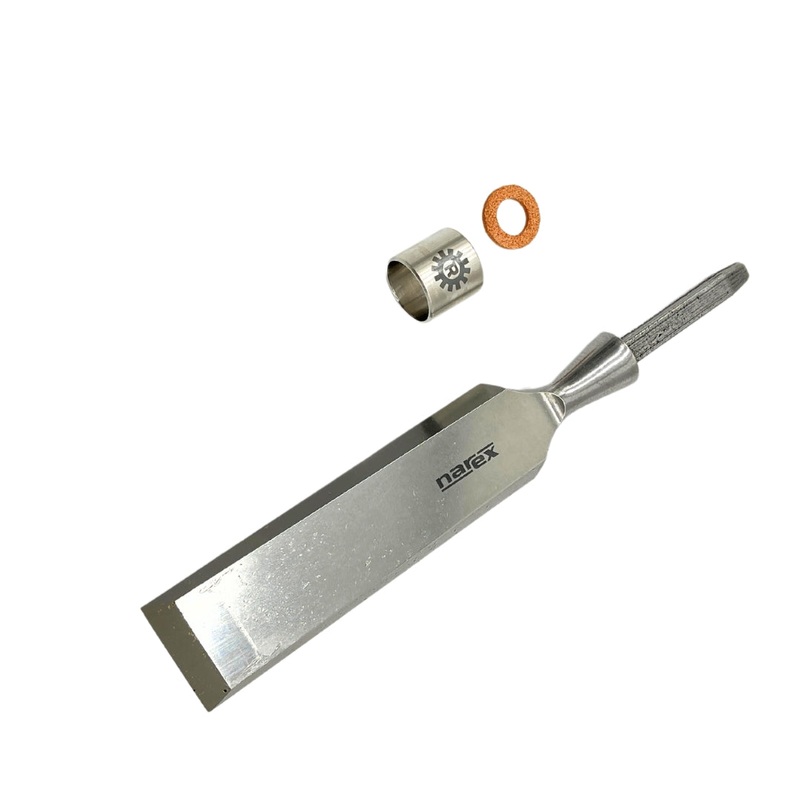 The Narex Richter Unhandled Chisels include a solid stainless-steel ferrule and a leather shock washer. The stainless steel ferrules have an outer diameter of 19.05 mm (0.750 inch), an inner diameter of 17.02 mm (0.670 inch), and a height of 18.03 mm (0.710 inch). The ferrules feature an inside bevel for easy insertion and are properly annealed (hardened) to prevent splitting when tangs are driven into the handle. Each ferrule is laser-etched with the Richter logo.