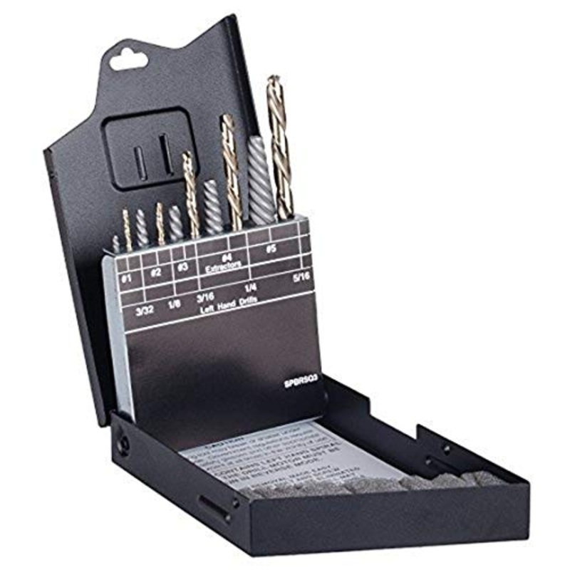 10 pc. Set Spiral Bolt Extractor and Left Hand DrillsTen Piece Bolt Extractor SetSpiral Extractors: EX-1, EX-2, EX-3, EX-4, EX-5Left Hand Drills: 3/32-inch, 1/8-inch, 3/16-inch, 1/4-inch,5/16-inchHi-Carbon Screw/Pipe Extractor Set