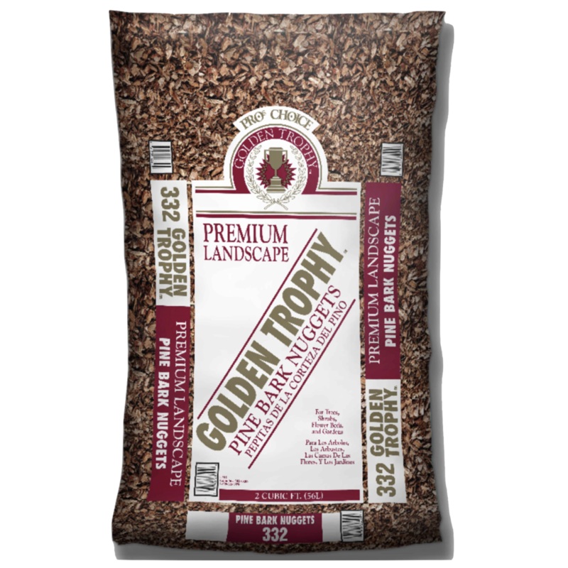 Nugget-sized pieces of pine bark, approximately 2-1/2 inches in diameter and brownish in color. This mulch is good for acid-loving plants, trees and bushes.