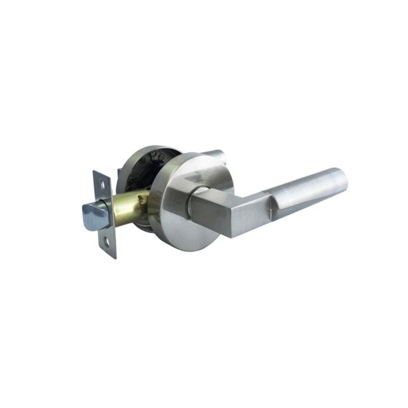 DescriptionRose backing plate with a bold, fashionable-style handle that draws on both square and round elementsSolid zinc alloy construction with a satin nickel finish (looks like brushed stainless steel)Suitable for both left and right hand opening doors