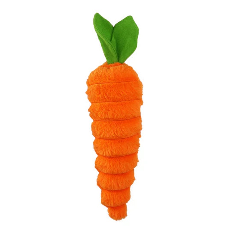 12" , 33" long carrot-shaped dog toy.Our Fresh Food line combines the delicious look of your favorite foods with the fun of a good dog toy.Made of new super-soft, durable plush in vivid color.An additional layer of fabric underneath the plush adds extra du