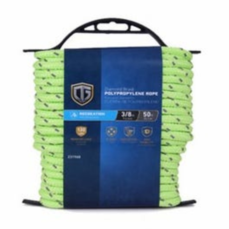 3/8" x 50', lime green high visibility twisted polypropylene reflective rope, 130 lb safety work load, light weight & floats, comes on winder.