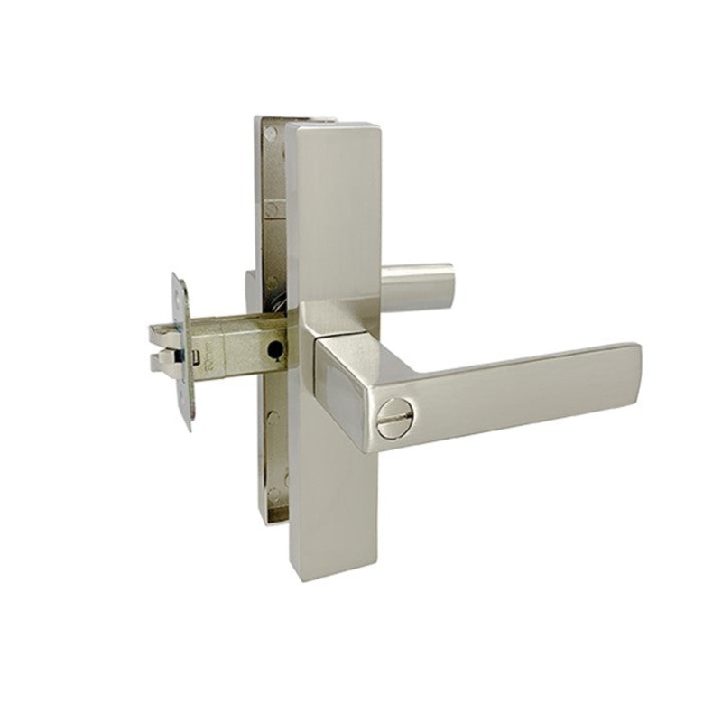 DescriptionRobust construction of solid alloy with brushed nickel finish (looks like brushed stainless steel)Snib lock from inside, emergency release button from outsideHandles are reversible for left or right-handed doorsSuitable for 32mm to 45mm thick do