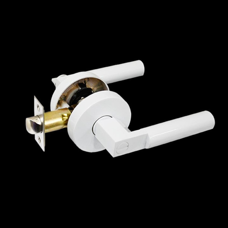 DescriptionRose backing plate with a refined, fashionable-style handle that draws on the elegance of its round elementsSolid zinc alloy construction with a pure white finish (powder coating)Snib lock from inside, emergency release button from outsideSuitab