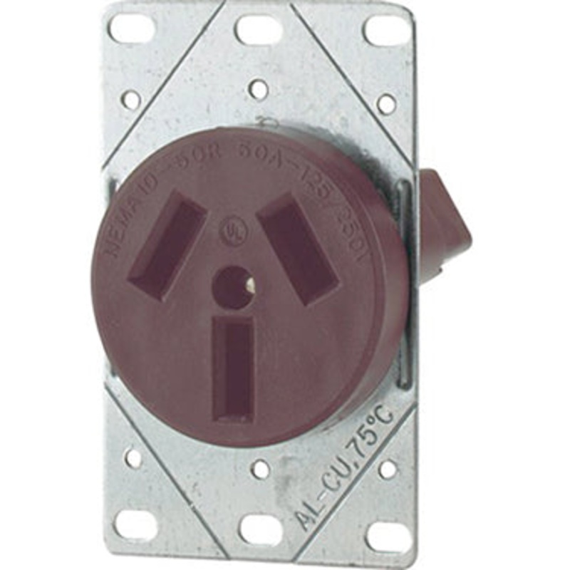 Wall-mounted. 50A, 125/250V rating. NEMA 10-50. 3-pole, 3-wire non-grounding. E-Z wire terminals accept up to #4 conductors. Use with copper or aluminum conductors. Fits single or two-gang rigid conduit outlet box or 1-1/2 x 4 square box with 1/2 or 3/4 raised two-gang cover. Brown. Boxed.