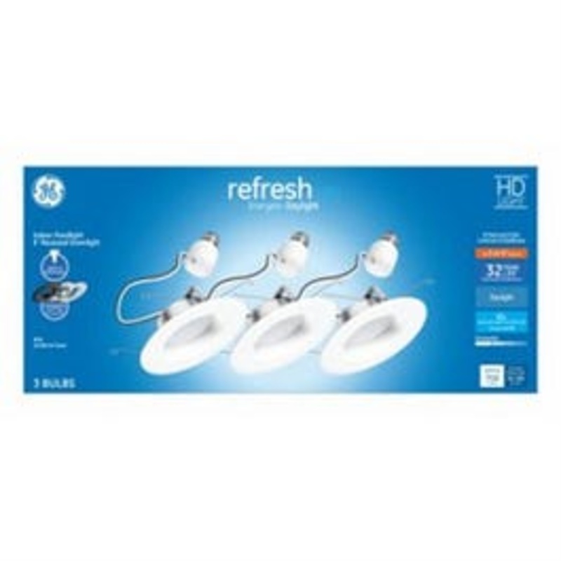 GE, 3 Pack, LED9DRS69CDLLT3, 9W, Daylight Light Color, White Bulb Color, Can Light Shape, Refresh High Definition, R30 Retrofit Kit, Equivalent To A 65W Incandescent, 25 Degree Beam, Medium Base, Dimmable, 700 Lumens, 5000 Kelvin Color Temperature, CRI = 90, 32 Year, 35,000 Hours Rated Life, MOL = 7.00″, CA Title 20: Yes, Boxed.