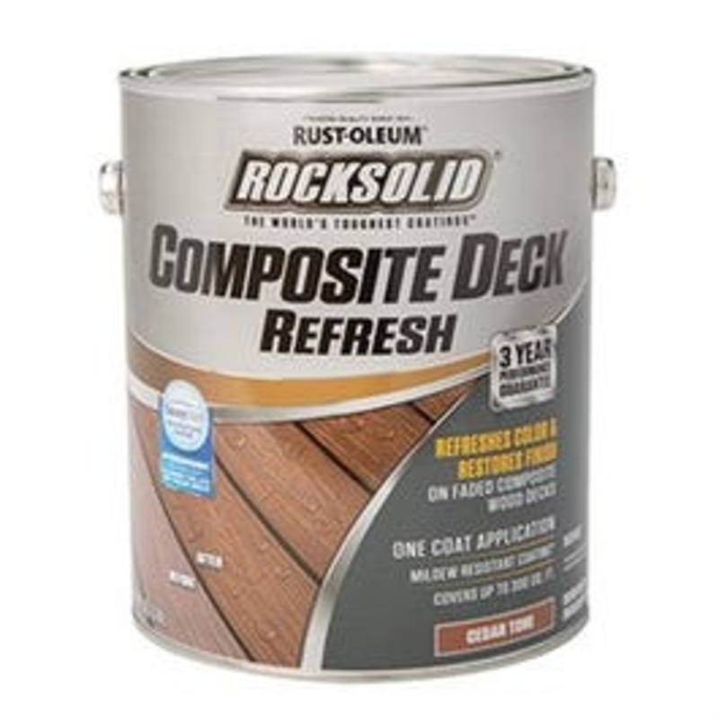 Rocksolid, gallon, cedar, composite deck refresh, water based exterior toner & sealer, refreshes the color, restores the finish on faded composite wood decks, protection against water damage, uv graying & mildew, neverwet properties for advanced water repellency, 1 coat application, use on wood capped composite decks only.