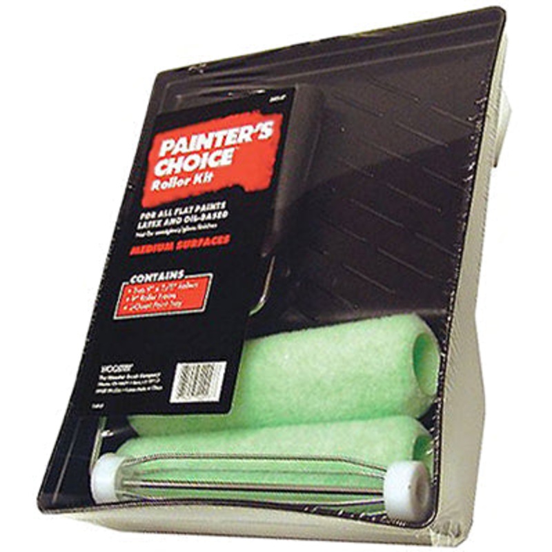 Consists of a plastic tray, plastic handled roller, and two 9" covers for medium surfaces. Width 9". Tray capacity 2 quarts.