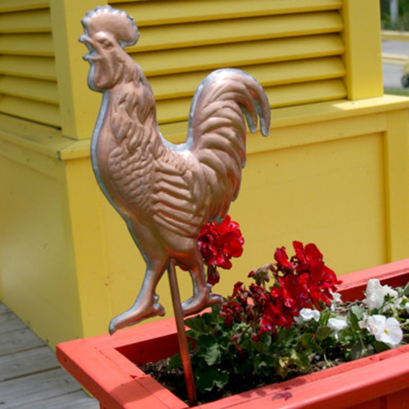 Rooster Garden Stake - Made in USA Measurements are: 24 High X 10" Wide Our Copper Handmade Rooster Garden Stakes are Made by Hand here in Maine and each garden stake is a one of a kind. To make this garden stake, we hand hammered, soldered, clipped, bent