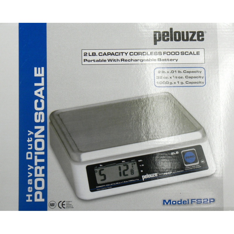 Rubbermaid Pelouze FS2P 2lb. Digital Portion Food ScaleTop loading counter modelDigital displayA/C power (rechargeable)ABS plastic housing7" x 7.5" s/s platformPortable with hold & tare feature2lb. x 1oz./2lb. x 1/8oz./900g x 2g graduationPortable with rec