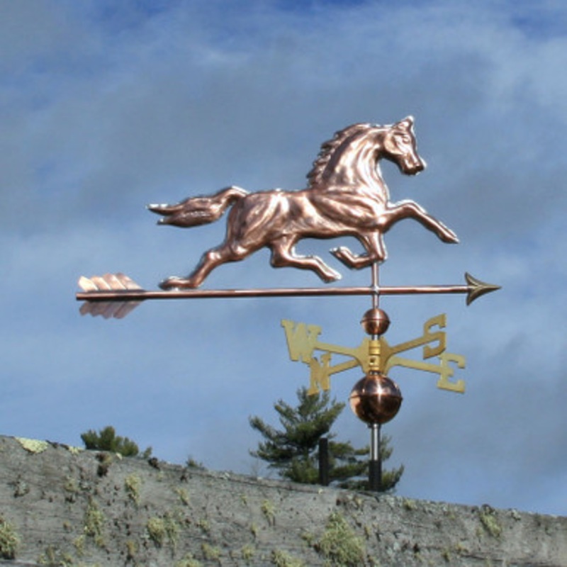 Horse Weathervane - Made in USA Elevate your outdoor space with the exquisite Running Horse Weathervane, a stunning tribute to American craftsmanship that seamlessly blends functionality with artistry. Crafted from durable copper, this medium-sized weather