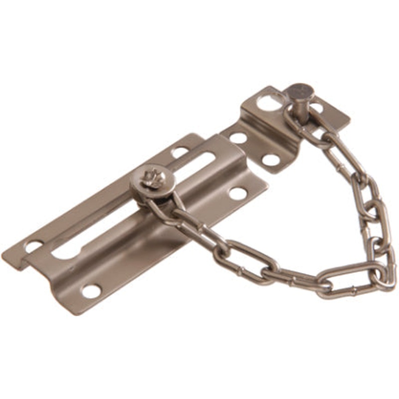 Allows viewing and ventilation while helping secure your door. Easy to install. Satin Nickel finish.