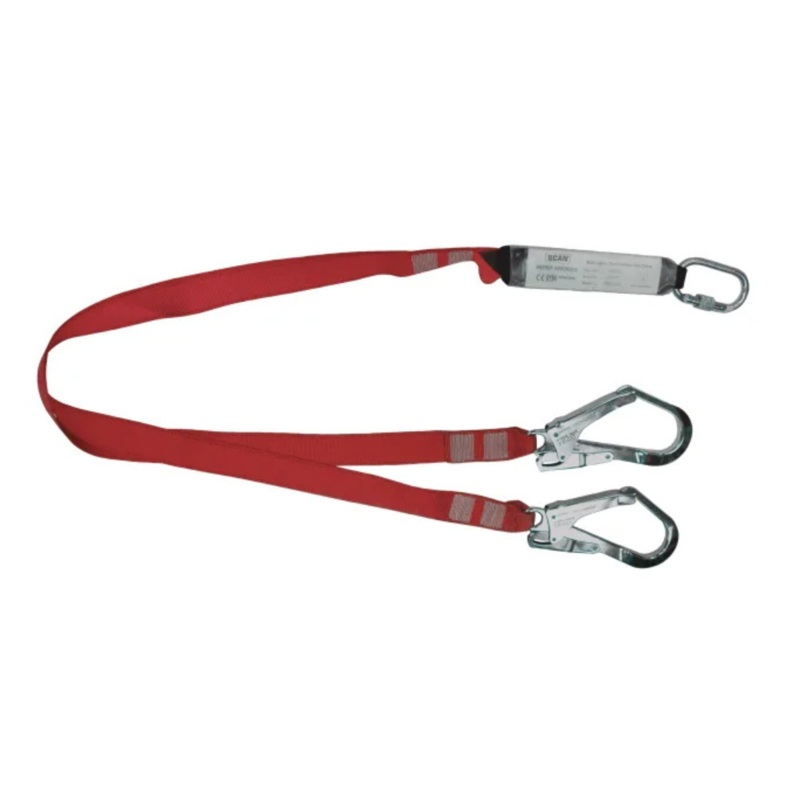 The Scan Fall Arrest Twin Lanyard works with the user's safety harness. Light, comfortable and easy-to-use with little restriction to movement. The twin webbing is made from 100% polyester. Fitted with one integrated shock absorber carabiner and 2 large, f